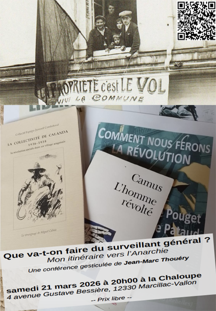 Mon itinéraire vers l'anarchie A partir de 20h30 Une conférence gesticulée, c’est une forme d’expression singulière mêlant conférence et théâtre. À la fois récit personnel et réflexion politique, elle s’appuie sur l’expérience vécue de l’intervenant, qui y mêle peu à peu une analyse critique et théorique du sujet abordé. À cette occasion, Jean-Marc Thouéry retracera son itinéraire vers l’anarchie, depuis ses premières révoltes adolescentes jusqu’à une réflexion approfondie sur cette idéologie libertaire fondée sur les principes de démocratie directe et d’autogestion. Participation libre, au chapeauBricolage musical de percussions, chants, bois, cuivres... avec l’objectif de déambuler en manif lors de rassemblements et fêtes ! Répétitions tous les 15 jours, de 17h30 à 20h Partitions et plus d'infos : 09 77 08 52 51 ou simmel12@riseup.net