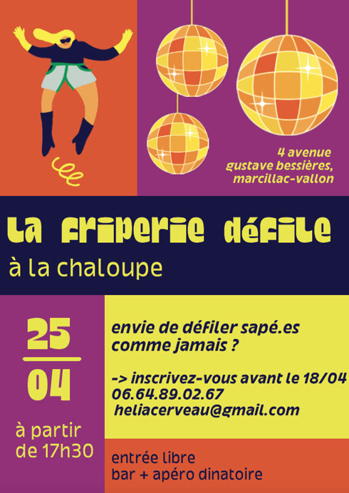 A partir de 18h00 La chaloupe se relooke le temps d'un défilé de mode. C'est le moment d'oser porter ta tenue la plus folle ou de sublimer les fripes d'Hélia ! Maquillage et coiffure improvisés seront de la partie. Inscription et renseignements : heliacerveau@gmail.com